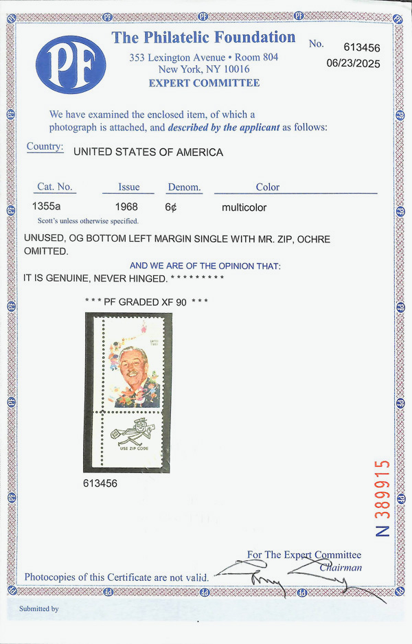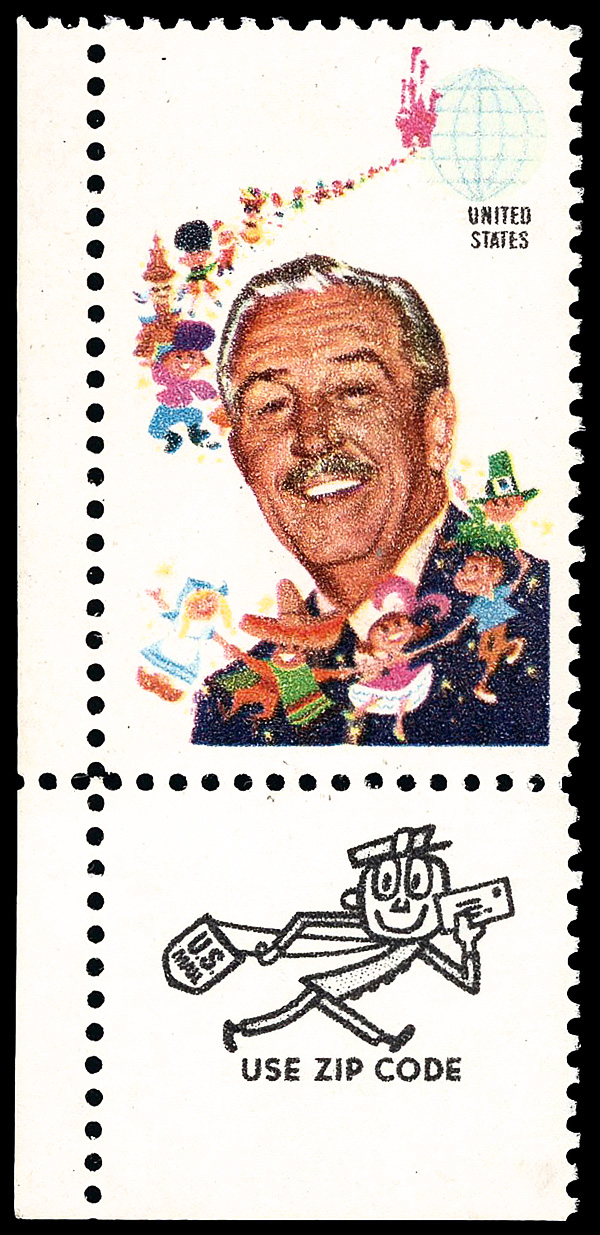 5128 nh 1355a image1968, 6¢ Disney, ocher omitted (Scott 1355a), 'USE ZIP CODE' corner margin single, o.g., never hinged, Extremely Fine, with 2025 P.F. certificate graded XF 90.