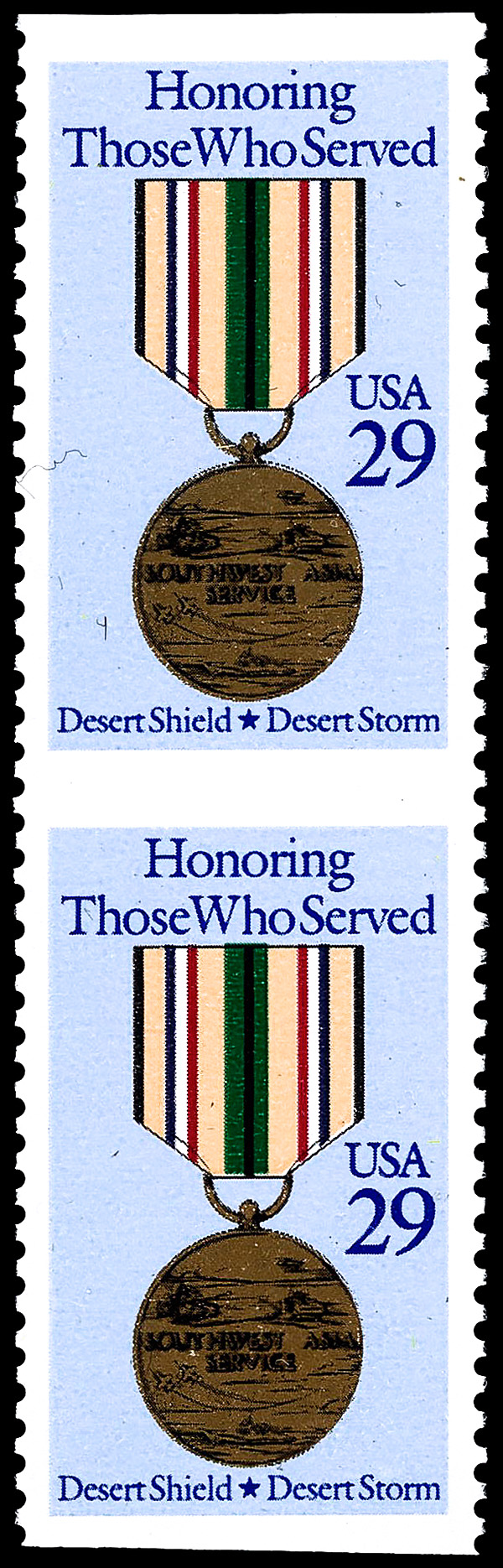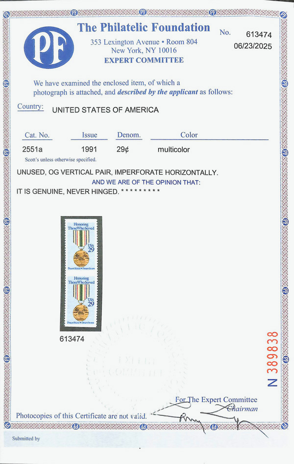 5143 nh 2551a image1991, 29¢ Desert Shield & Desert Storm, vertical pair, imperf. horizontally (Scott 2551a), o.g., never hinged, Extremely Fine, with 2025 P.F. certificate.