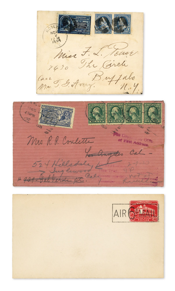 5157 cover E5//E11 imageGroup of Special Delivery & Airmail Covers, 1895-1923 (Scott E5//E11), features three covers, all with PF certs; one cover features E11a and two horizontal pairs of #543 on cover, all tied by Fort Wayne Feb. 6, 1923 duplex cancels on cover to Los Angeles; other cover features E5 with horizontal pair of #264 all tied by Roslyn, N.Y. Nov. 2, 1895" postmark and cork cancels to Buffalo, New York with numerous transits; additionally features unused UC9; an attractive group. (PDF2 for this Lot) (Image) Suggested Bid $64