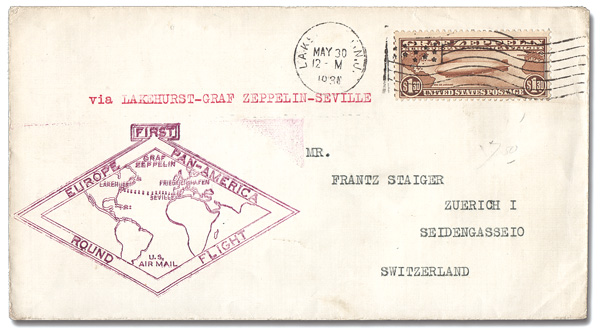 5154 cover C14 imageAirmail, 1930, $1.30 Graf Zeppelin (Scott C14), tied by a May 30 Lakehurst machine cancel on a return flight cover from Lakehurst to several, addressed to Zurich, Switzerland.