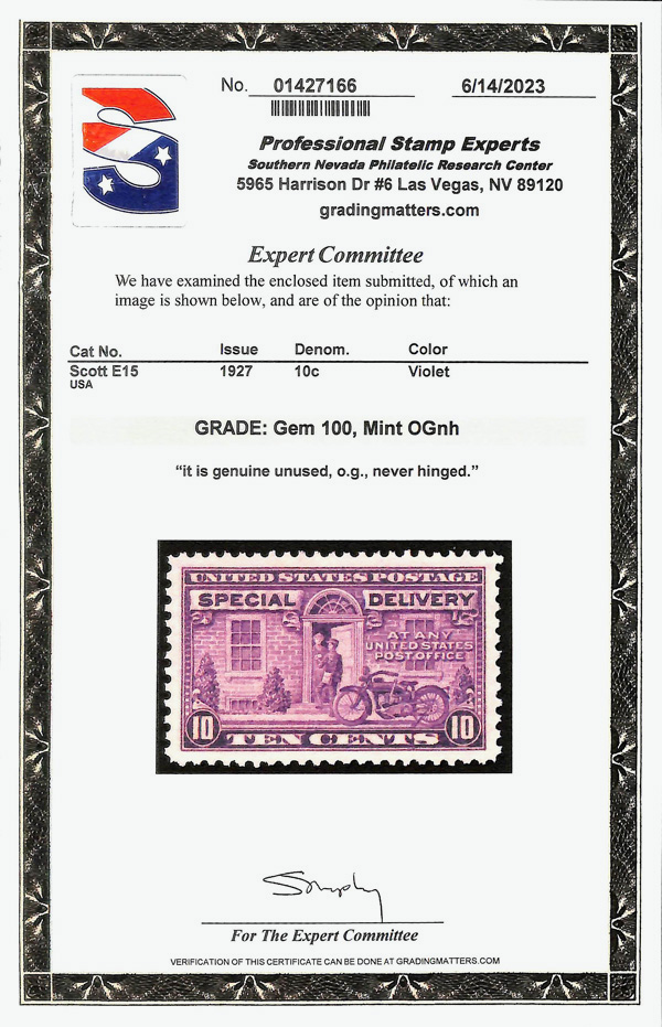 5159 nh E15 imageSpecial Delivery, 1927, 10¢ gray violet (Scott E15), o.g., never hinged, in the gorgeous and preferred violet color, mathematically perfect centering and pristine gum, well worthy of the grade of Superb, only 12 others have achieved this grade and none are graded 100J, with 2023 P.S.E. certificate graded GEM 100.