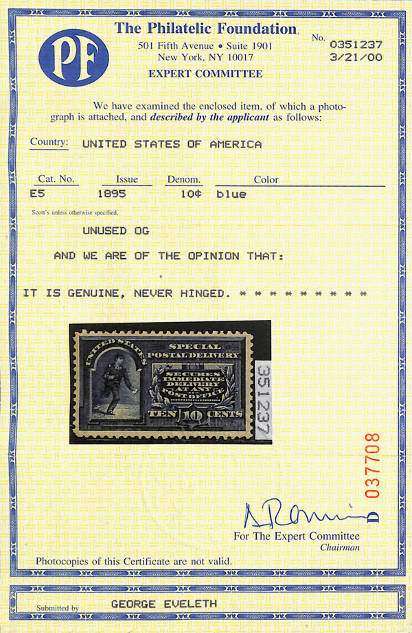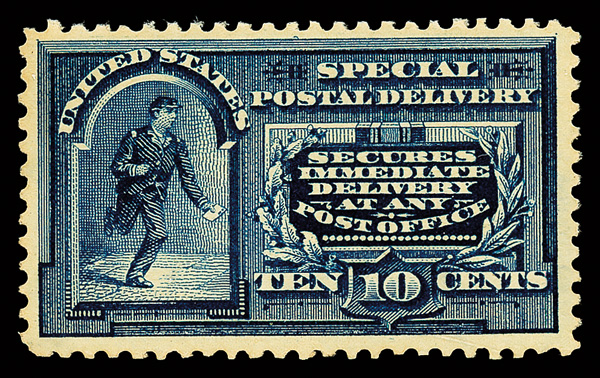 5156 nh E5 imageSpecial Delivery, 1895, 10¢ blue (Scott E5), o.g., never hinged, a pretty stamp with bold color and clean impression, sound and sharp, Very Fine, with 2000 P.F. certificate.