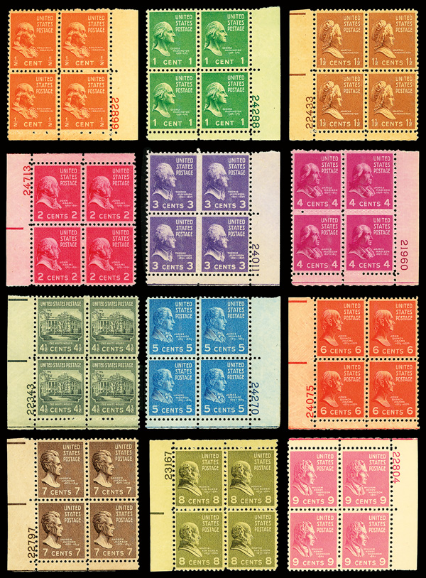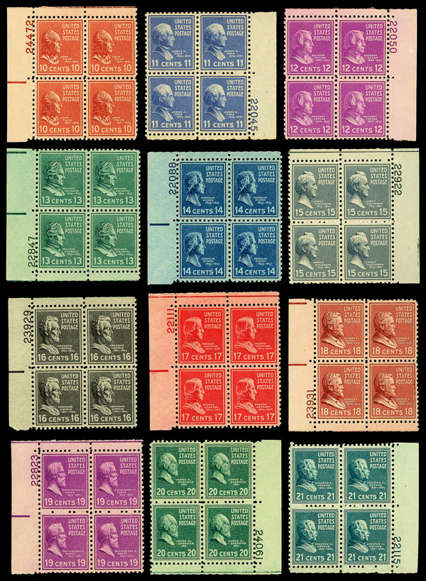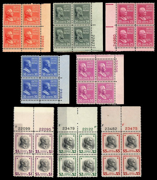 5121 nhbl 803-834 image1938, Presidential Issue, ½¢ to $5 complete (Scott 803-834), set of 32, plate blocks of 4, o.g., never hinged, bright and clean throughout, each with solid, attractive centering, Very Fine.