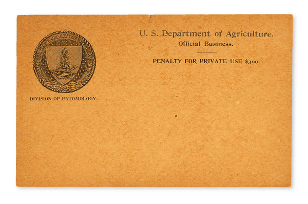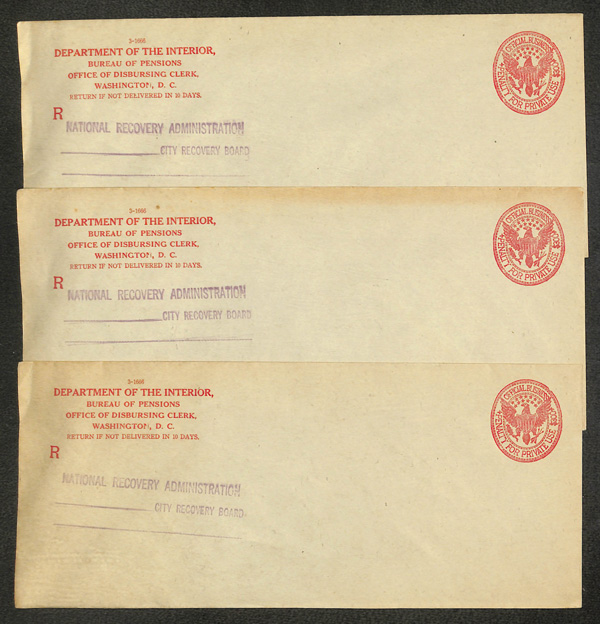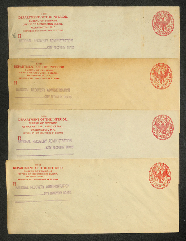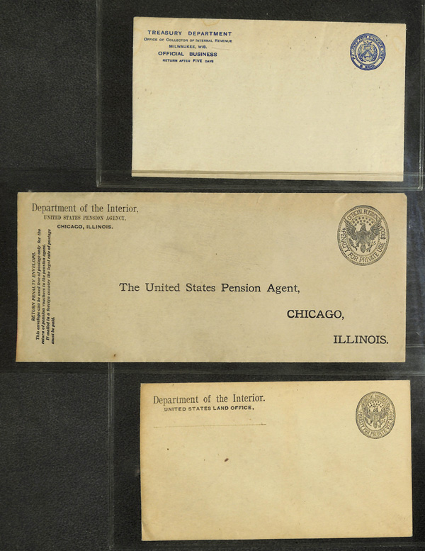 5184 og   imageOfficial Envelope, Group of 11 "Penalty for Private Use" envelopes or cards, nice mix of these interesting items, comprising one postal card for the Dept. of Agriculture (Division of Entomology) with 1896-dated pre-printed message on reverse, and ten envelopes: Treasury Dept. (Collector of Internal Revenue, Milwaukee, WI); Dept. of the Interior US Land Office, Bureau of Pensions/National Recovery Administration (7), and Pension Agency; condition varies; worth review, Fine to Very Fine. (Image) (Image2) (Image3) (Image4) (All Images)