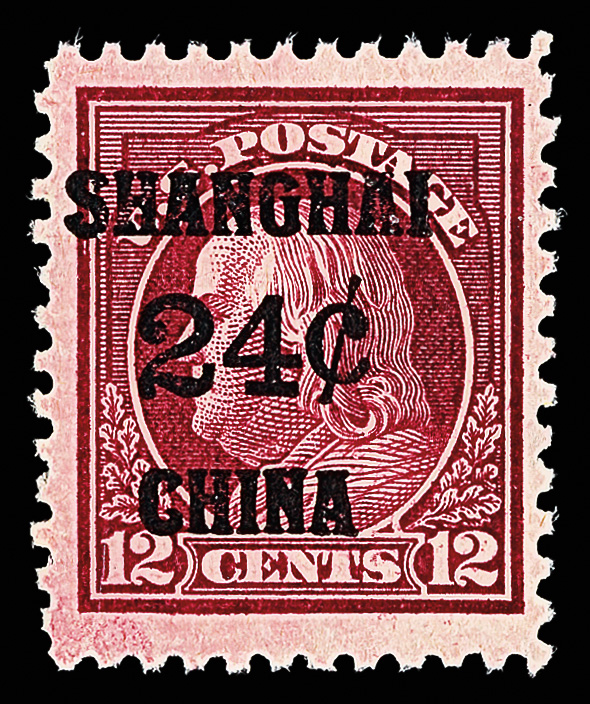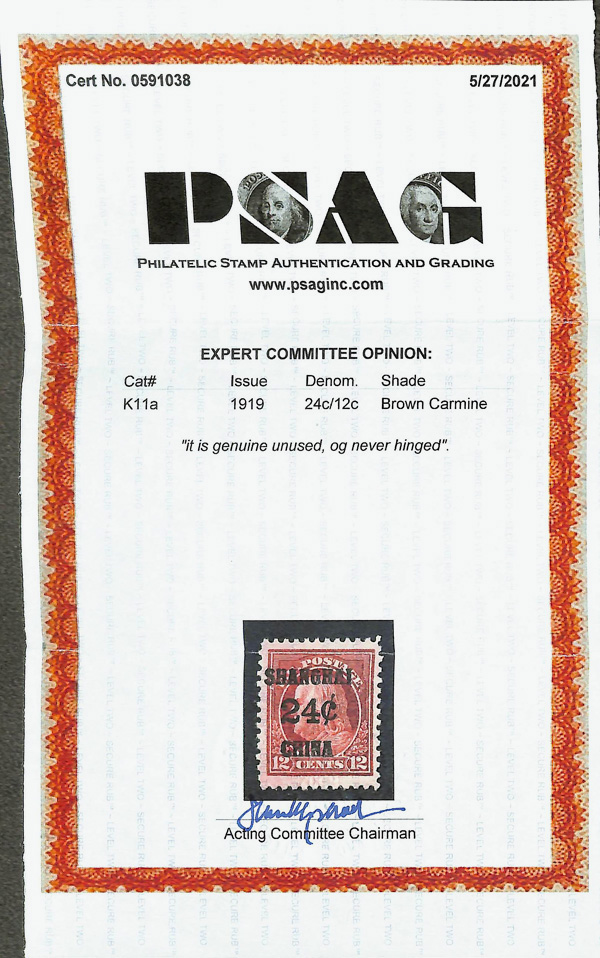 5166 nh K11 imageOffices in China, 1919, 24¢ on 12¢ brown carmine (Scott K11), o.g., never hinged, a huge stamp with incredibly deep color and bold overprint, sound on fresh paper sporting jumbo margins, Very Fine to Extremely Fine, with 2021 P.S.A.G. certificate (erroneously as #K11a).