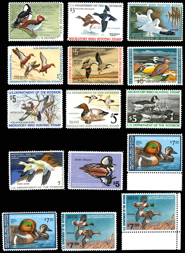 5190   imageFederal Duck Stamp, A Quackery of Ducks, 1968-2015, lovely, fresh and bright gathering of #RW35//RW82A, presented on stockpages, offering either a solid start to a collection or plenty of stock for the hungry dealer; comprises singles #RW35-RW45, RW46 (2), RW47 (2), RW50, RW54-RW63, RE64 (2), RW65-RW67, RW73-RW82, plus bottom right plate block of four #RW82; souvenir sheets of one #73b (4, each signed by designer and engraver) and 78b (with 2011 PSE certificate graded XF-SUP 95); self-adhesive panes of one #RW65A-RW66A (both signed), RW67A (2), and RW74A-RW82A; also a smidgeon of Junior Duck Stamps, singles #JDS14-JDS16 (#JDS14 artist-signed) plus control/plate blocks of four #JDS17-JDS23; sound and Post Office fresh throughout, o.g., never hinged, Very Fine with better, fully imaged online. Shipping charges apply - weight 0.8 lbs.