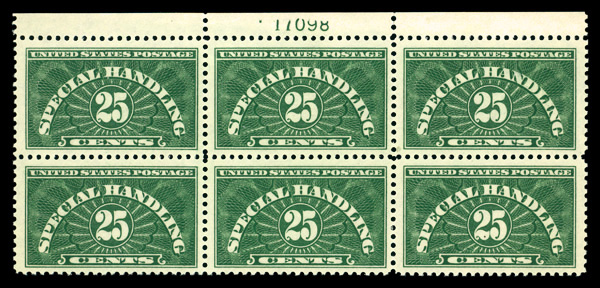 5173 nhbl QE4a imageSpecial Handling, 1928, 25¢ yellow green (Scott QE4a), plate block of 6, o.g., never hinged, Very Fine.