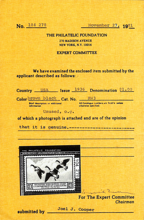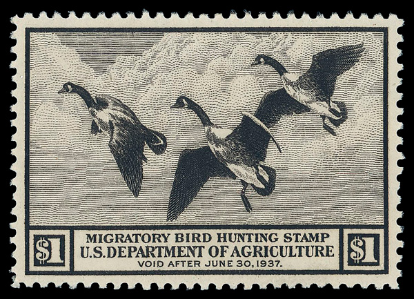5195 nh RW3 imageFederal Duck Stamp, 1936, $1 Canada Geese (Scott RW3), o.g., never hinged (gum skip), Extremely Fine to Superb, with 1981 P.F. certificate.