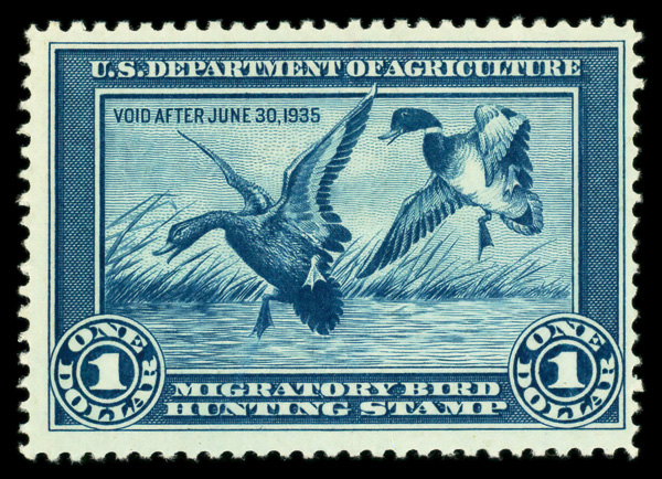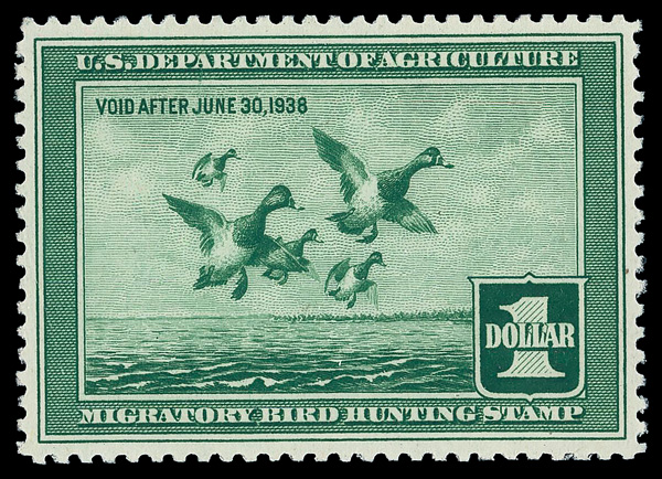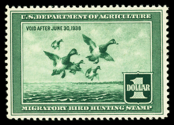 5197 nh RW4 imageFederal Duck Stamp, 1937, $1 Scaup Ducks (Scott RW4), o.g., never hinged (minor gum skips), Very Fine to Extremely Fine.