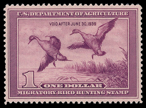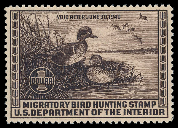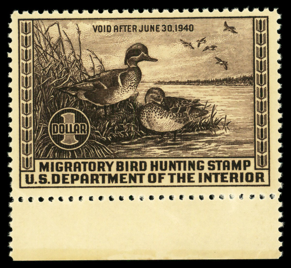 5200 nh RW6 imageFederal Duck Stamp, 1939, $1 Green-winged Teals (Scott RW6), o.g., never hinged, Very Fine to Extremely Fine.