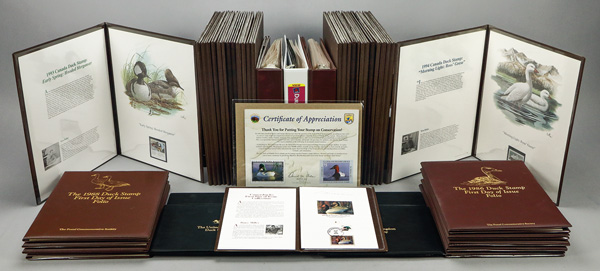 5191   imageUnited States, Federal Duck Art 2006-2017, 18 limited edition signed panels with MNH high value Federal Ducks in Fleetwood presentation folders; 40+ Certificates of Appreciation (about half with canceled Ducks); 8 Fleetwood presentation folders with 1990s Canadian Ducks, 9 First Day of Issue Postal Commemorative Society folders with Federal Ducks, and 4 Fleetwood UK Duck presentation folders; stunning, Very Fine. Shipping charges apply - weight 64.8 lbs. (PDF for this Lot) (Image) Suggested Bid $500