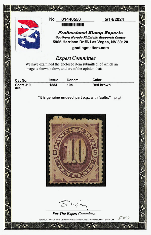 5161 og J19 imagePostage Due, 1884, 10¢ red brown (Scott J19), single, part o.g. (album adherence); With faults., Fine, with 2024 P.S.E. certificate.
