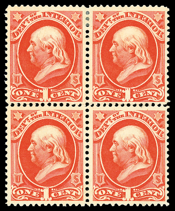 5167 ngbl O15 imageInterior Dept., 1873, 1¢ vermilion (Scott O15), block of 4, unused without gum, sound and fresh with rich, bright color and clean detail, Fine to Very Fine.