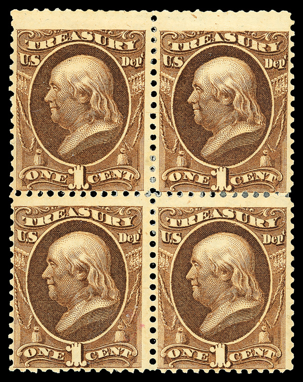 5168 ogbl O72 imageTreasury Dept., 1873, 1¢ brown (Scott O72), block of 4, clean with profound color and exceptionally wide top margin; hinged (reinforcing at right), short gummed and light crease from hinge removal at top, Fine.