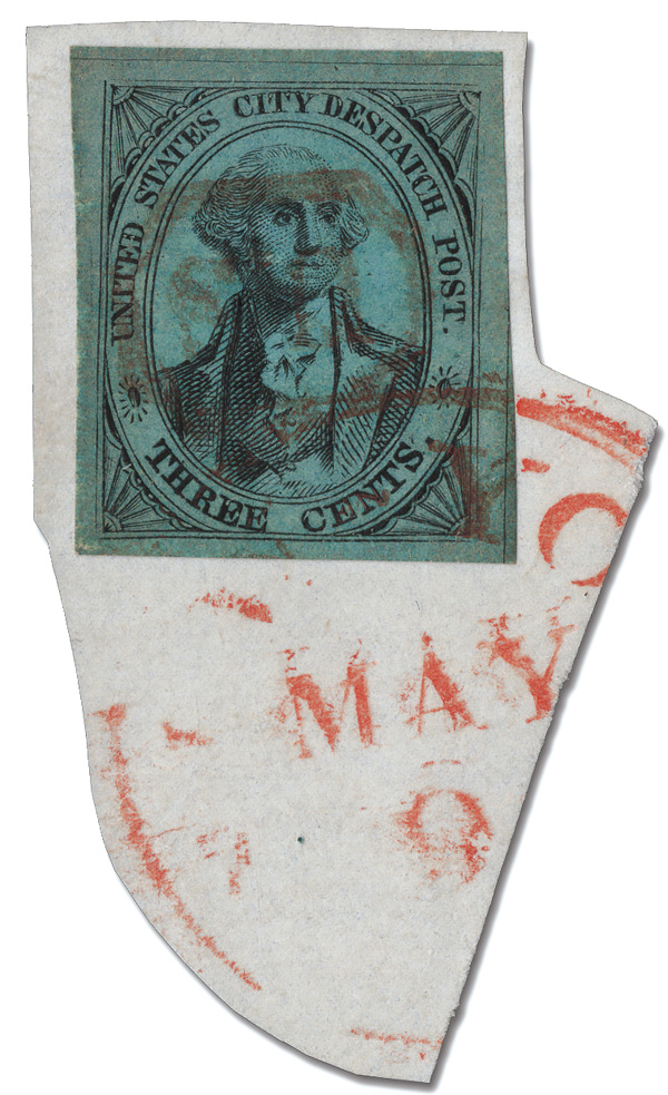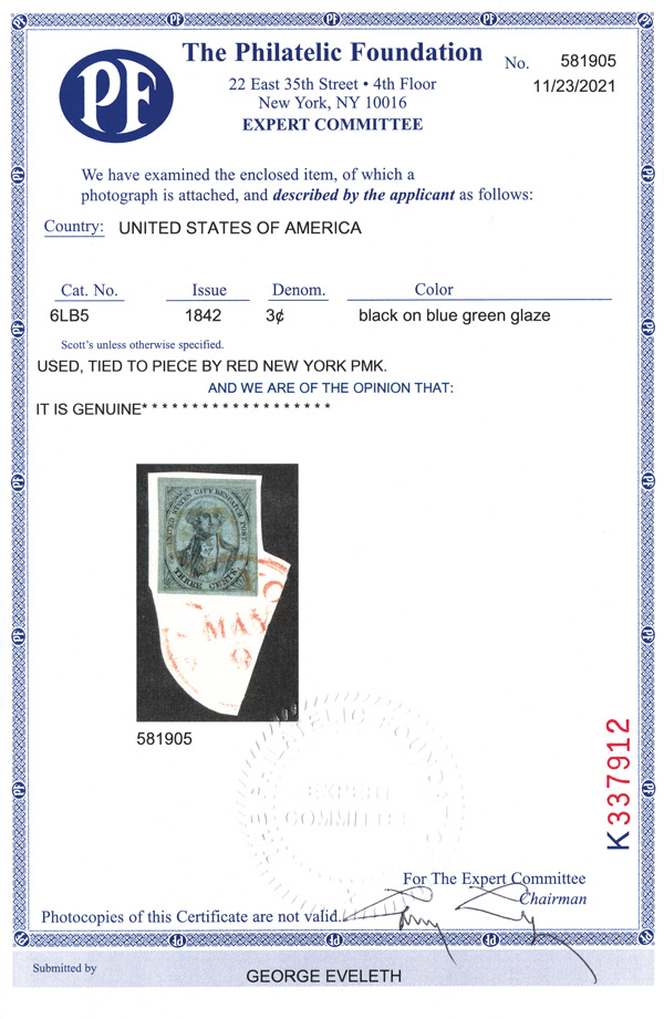 5176 Z 6LB5 imageNew York, N.Y., U.S. City Despatch Post, 1842-45, 3¢ black on blue green (Scott 6LB5), exceptionally fresh with ample to mostly large margins, canceled with a red "US." octagon and tied on an irregular piece by a red "New-York, May 9" c.d.s., Very Fine to Extremely Fine, with a 2021 P.F. certificate.