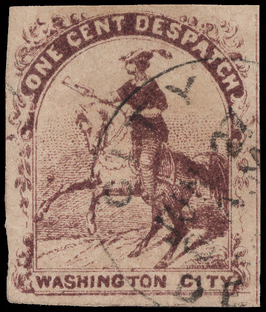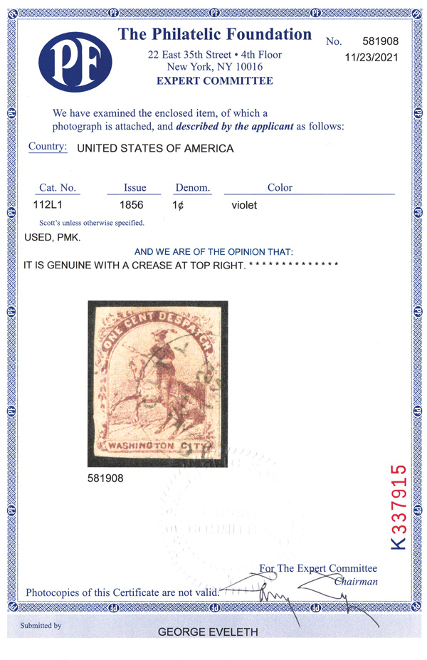 5177 O 112L1 imageOne Cent Despatch, 1856, Washington D.C., 1¢ violet (Scott 112L1), clear to large margins with full dividing line at the right and a neat partial "City (Despatch) Jun 27…"; tiny, light corner crease at the upper right, Very Fine appearance, with a 2024 P.F. certificate.