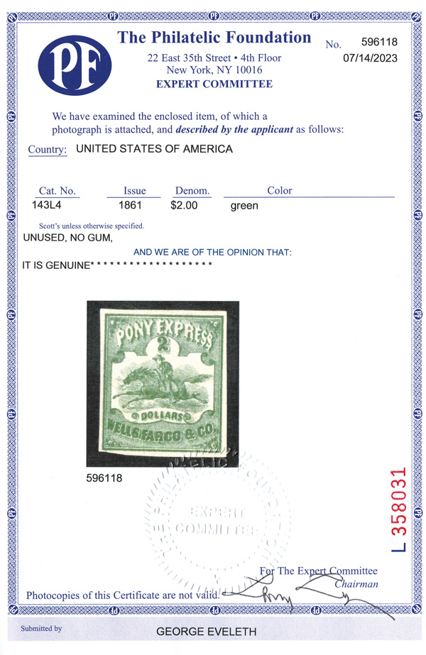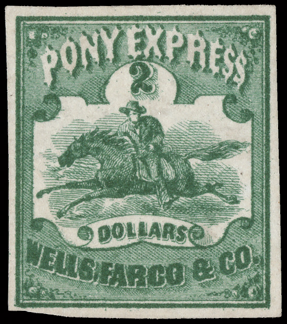 5178 ng 143L4 imageWells Fargo & Co., 1861, $2 green (Scott 143L4), unused without gum, wonderfully fresh with marvelous color and large margins ex a bit close at the lower left, Very Fine.