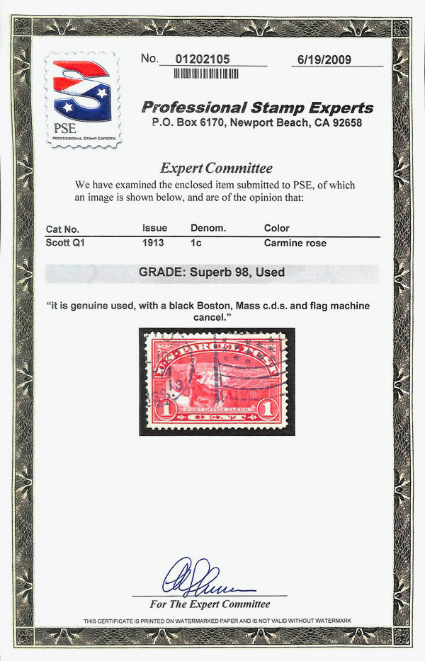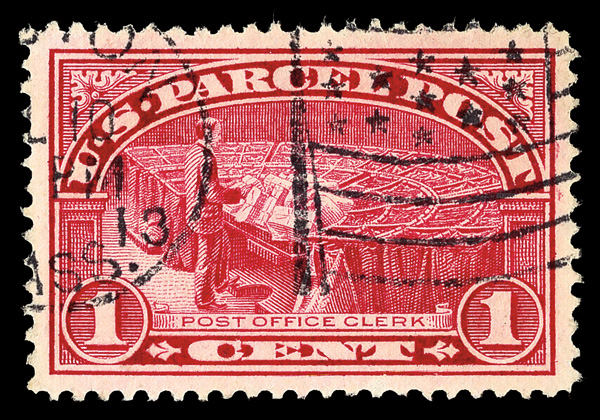5170 O Q1 imageParcel Post, 1913, 1¢ Post Office Clerk (Scott Q1), Boston Mass. 1913 flag machine cancel, bright color on bright white paper, choice centering, Superb, Of all of the used 1¢ Parcel Post stamps extant, this is the only example to achieve this grade and 4 others have been graded 98J. None have been graded 100 or 100J., with 2009 P.S.E. certificate graded SUP 98.