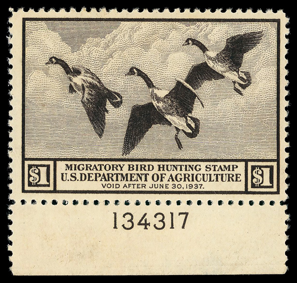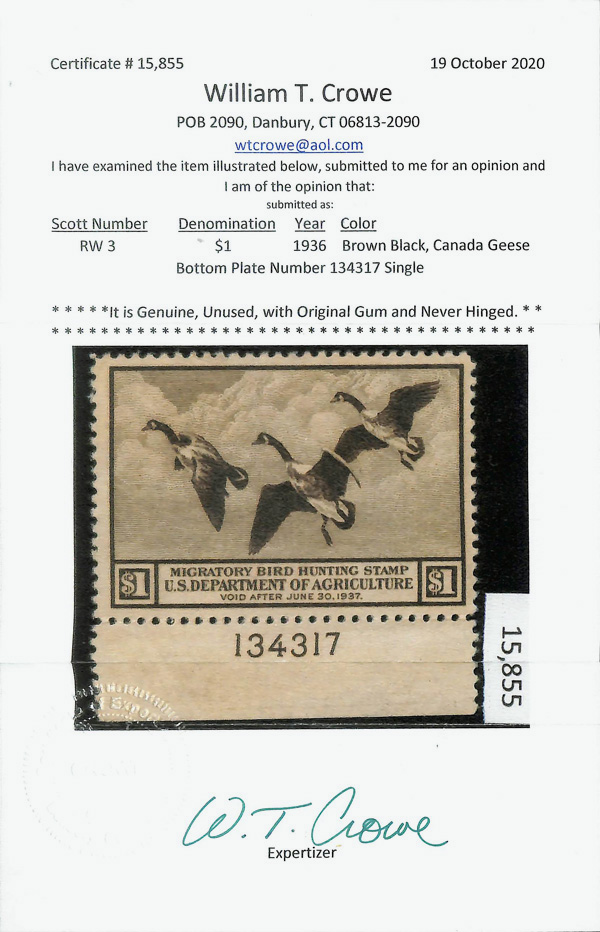 5194 nh RW3 imageFederal Duck Stamp, 1936, $1 Canada Geese (Scott RW3), plate number single, o.g., never hinged, Very Fine to Extremely Fine, with 2020 Crowe certificate.