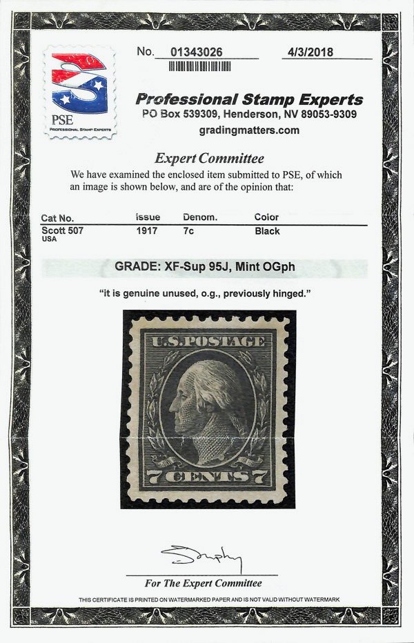 7121 og 507 image1917, 7¢ black, perf. 11 (Scott 507), o.g., lightly hinged, jumbo margins, Extremely Fine to Superb, with 2018 P.S.E. certificate graded XF-SUP 95J.