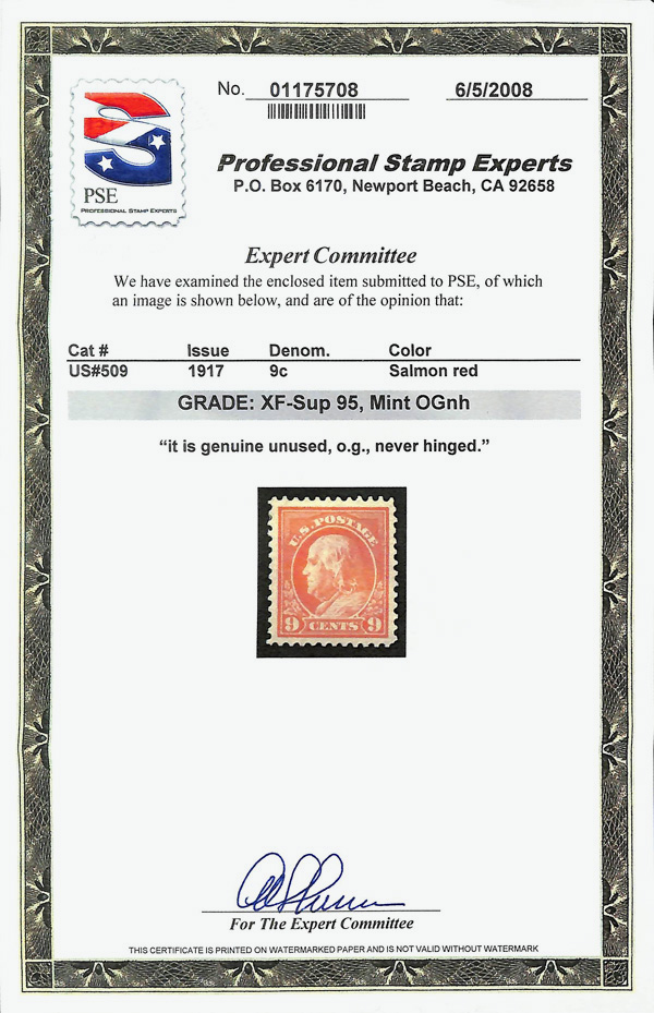 7123 nh 509 image1917, 9¢ salmon red, perf. 11 (Scott 509), o.g., never hinged, Extremely Fine to Superb, with 2008 P.S.E. certificate graded XF-SUP 95.