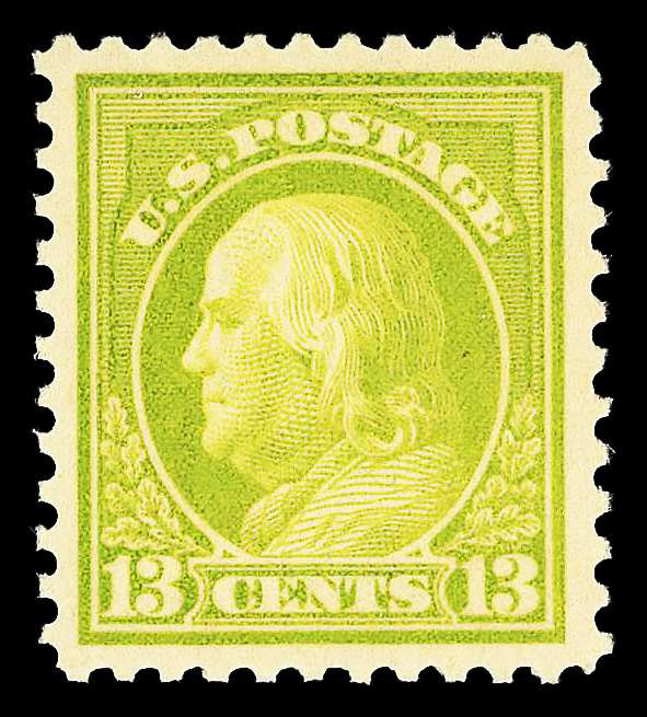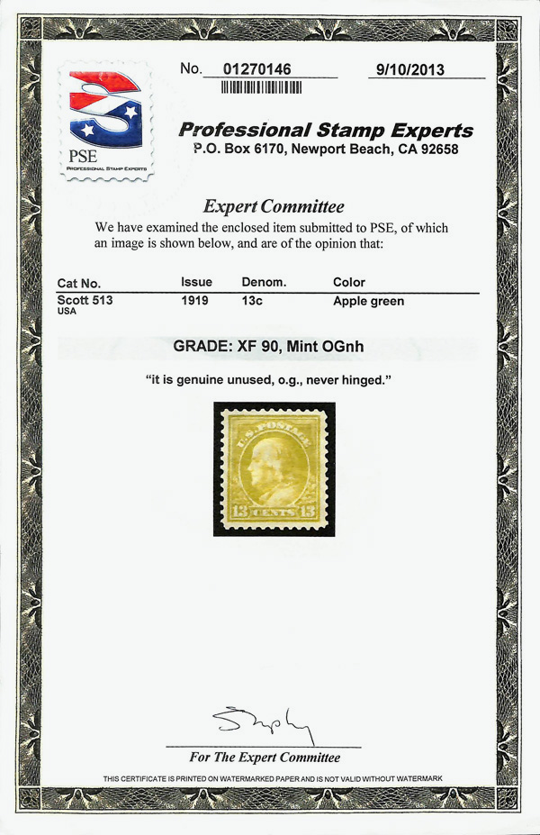 7125 nh 513 image1919, 13¢ apple green, perf. 11 (Scott 513), o.g., never hinged, Extremely Fine, with 2013 P.S.E. certificate graded XF 90.