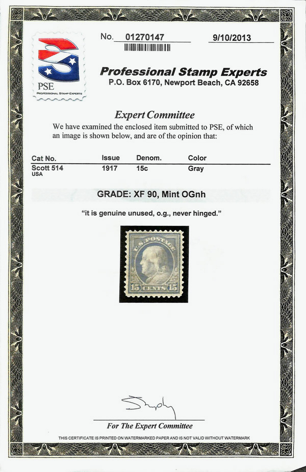 7126 nh 514 image1917, 15¢ gray, perf. 11 (Scott 514), o.g., never hinged, Extremely Fine, with 2013 P.S.E. certificate graded XF 90.