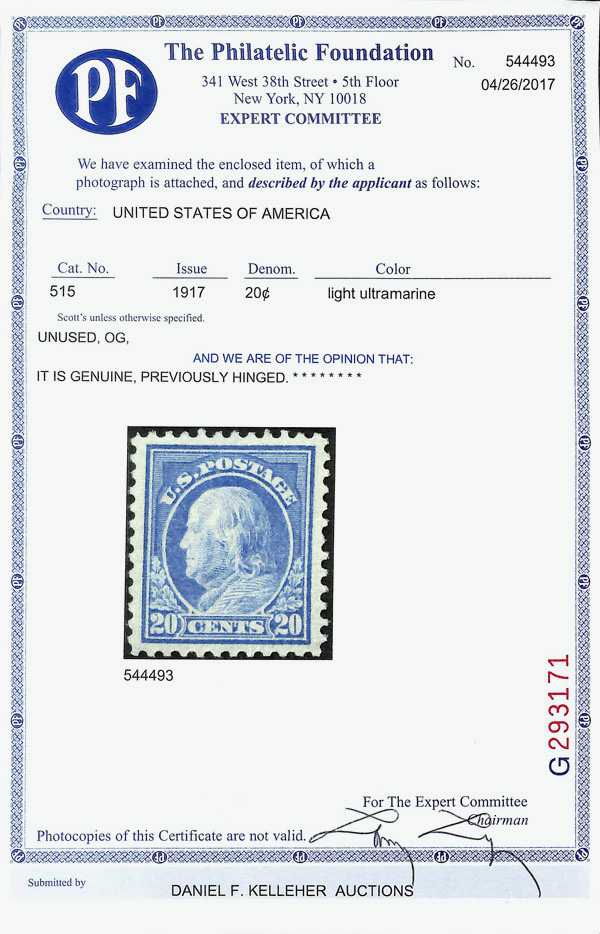 7127 og 515 image1917, 20¢ light ultramarine, perf. 11 (Scott 515), o.g., lightly hinged, Extremely Fine to Superb, with 2017 P.F. certificate.