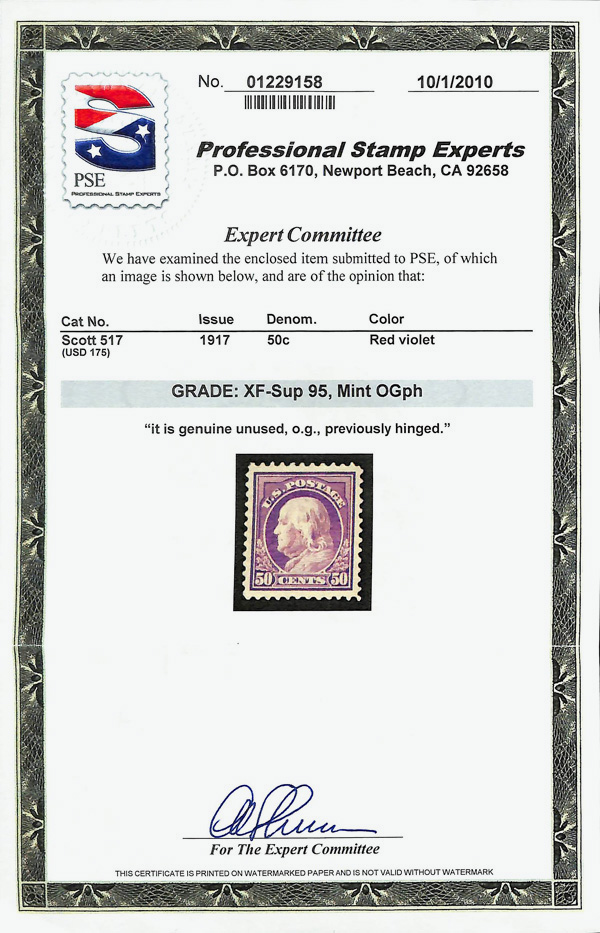 7129 og 517 image1917, 50¢ red violet, perf. 11 (Scott 517), o.g., lightly hinged, Extremely Fine to Superb, with 2010 P.S.E. certificate graded XF-SUP 95.