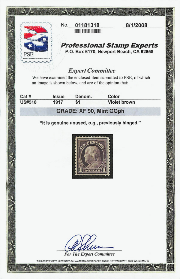 7130 og 518 image1917, $1 violet brown, perf. 11 (Scott 518), o.g., very lightly hinged, Extremely Fine, with 2008 P.S.E. certificate graded XF 90.