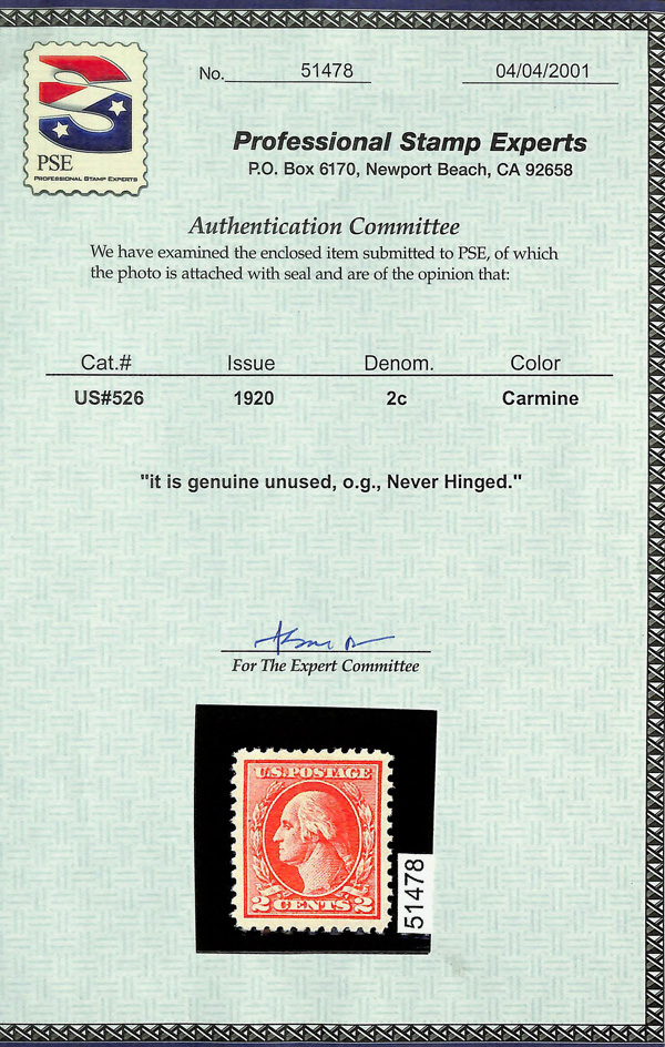7131 nh 526 image1920, 2¢ carmine, type IV, offset printing (Scott 526), o.g., never hinged, Extremely Fine to Superb, with 2001 P.S.E. certificate.