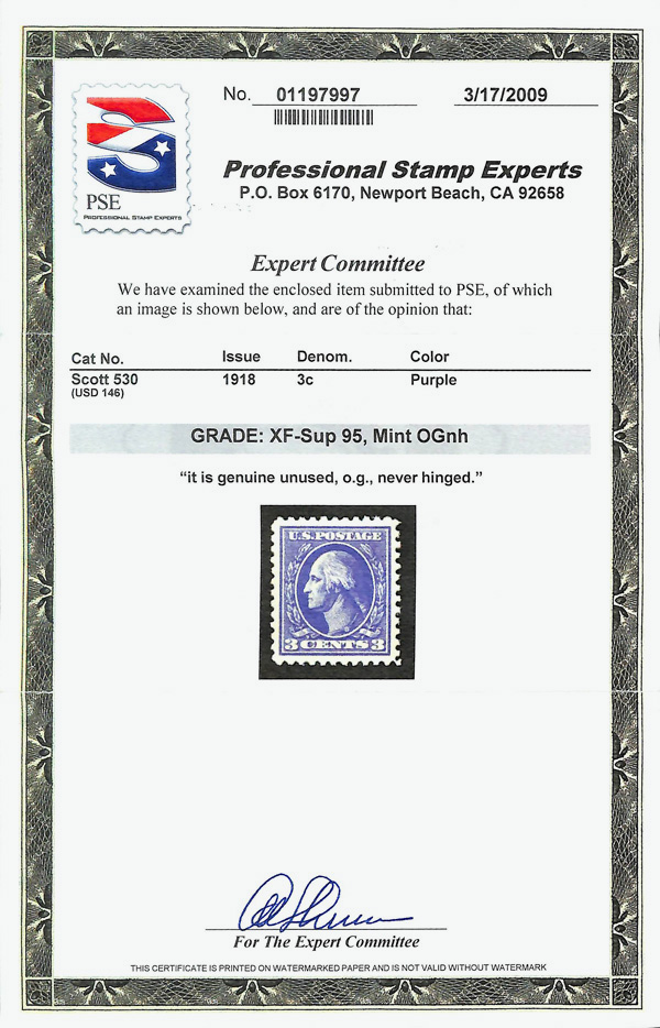7135 nh 530 image1918, 3¢ purple, type IV, offset printing (Scott 530), o.g., never hinged, Extremely Fine to Superb, with 2009 P.S.E. certificate graded XF-SUP 95.