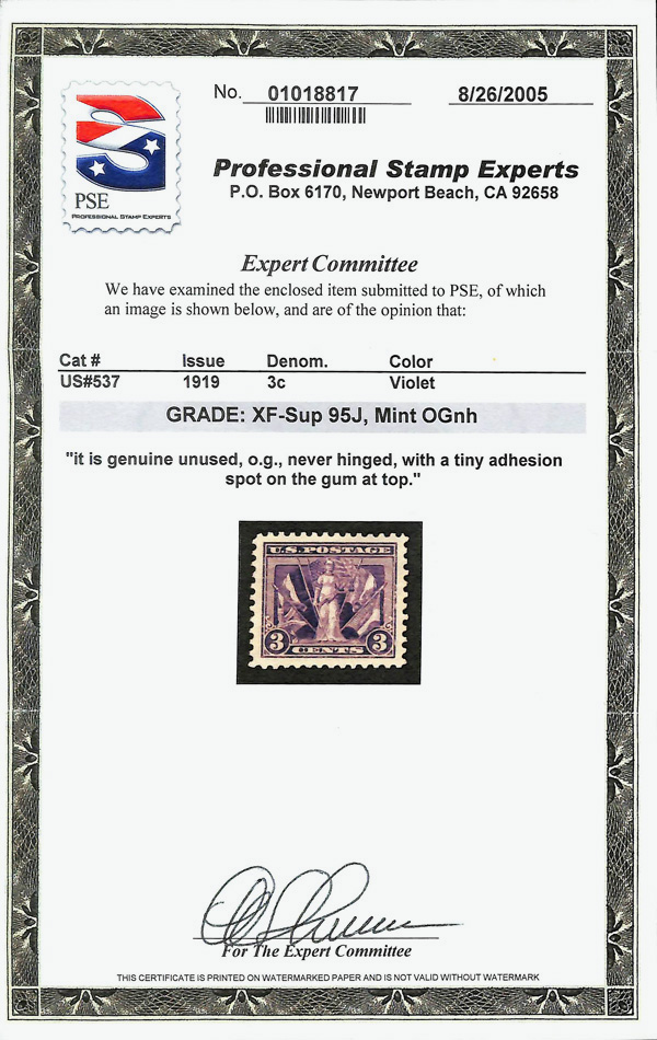 7141 nh 537 image1919, 3¢ Victory, violet (Scott 537), o.g., never hinged (tiny adhesion spot noted on cert.), jumbo margins, Extremely Fine to Superb, with 2005 P.S.E. certificate graded XF-SUP 95J.