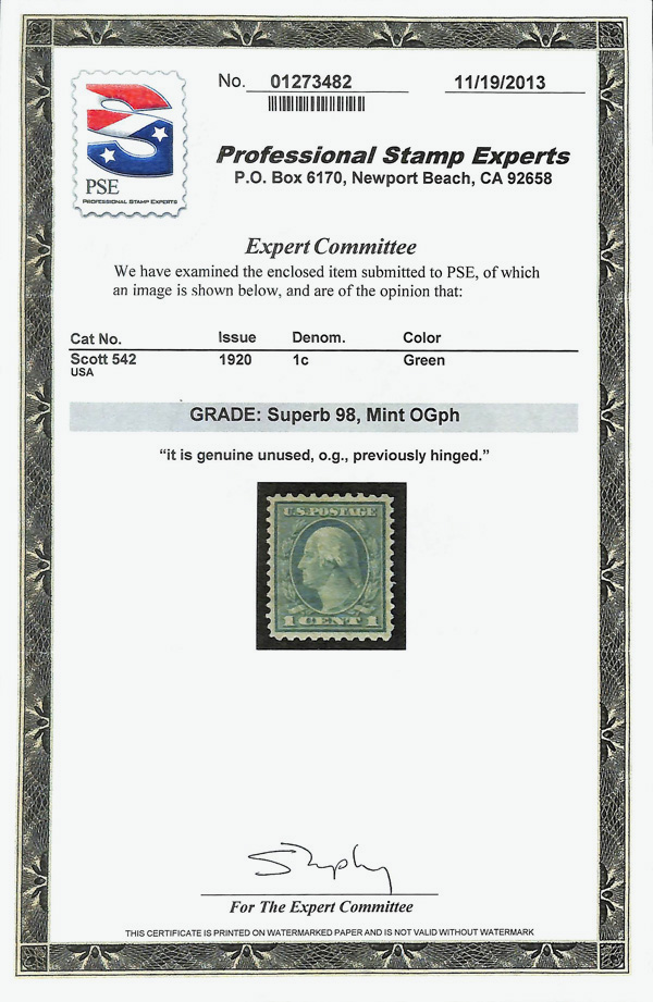 7146 nh 548 image1920, 1¢ Pilgrim (Scott 548), o.g., never hinged, Extremely Fine to Superb, with 2013 P.S.A.G. certificate graded XF-SUP 95.
