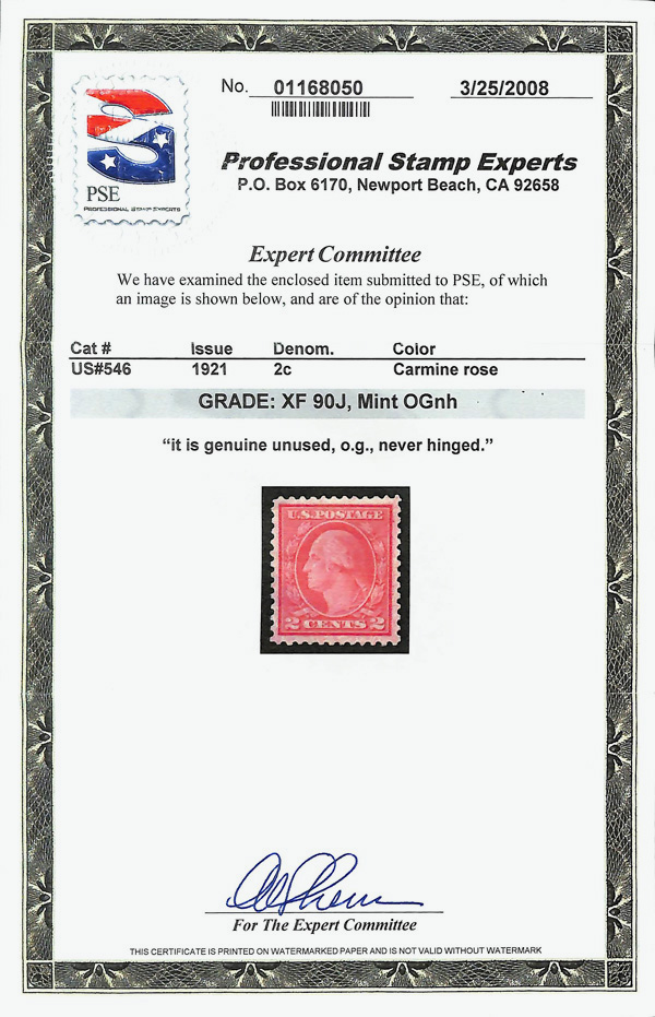 7145 nh 546 image1921, 2¢ carmine rose, type III, rotary press coil waste, perf. 11 (Scott 546), o.g., never hinged, jumbo margins, Extremely Fine, with 2008 P.S.E. certificate graded XF 90J.