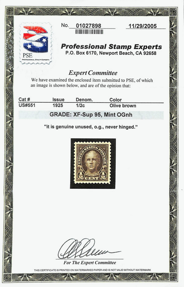 7148 nh 551 image1925, ½¢ Nathan Hale (Scott 551), o.g., never hinged, Extremely Fine to Superb, with 2005 P.S.E. certificate graded XF-SUP 95.