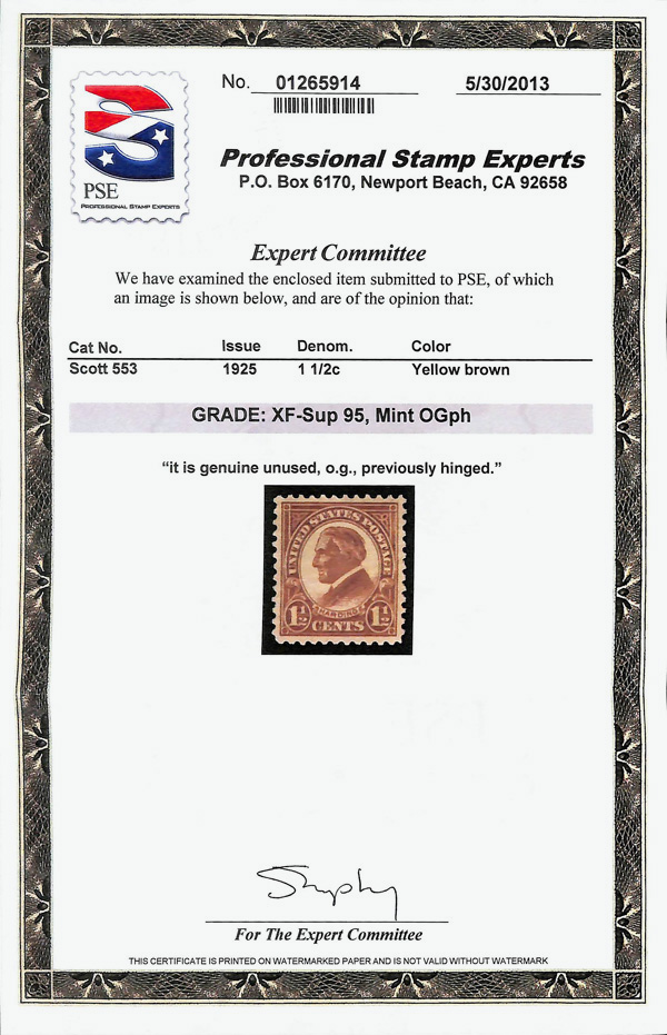 7149 og 553 image1925, 1½¢ Harding (Scott 553), o.g., very lightly hinged, Extremely Fine to Superb no SMQ for XF-SUP 95 OGph, with 2013 P.S.E. certificate graded XF-SUP 95.