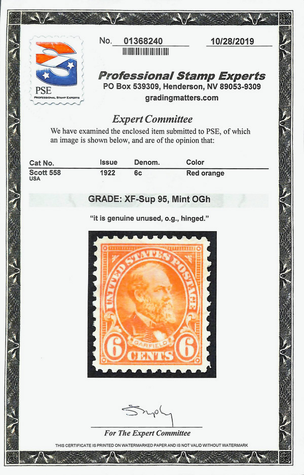7150 og 558 image1922, 6¢ Garfield (Scott 558), o.g., small hinge remnant, Extremely Fine to Superb, with 2019 P.S.E. certificate graded XF-SUP 95.