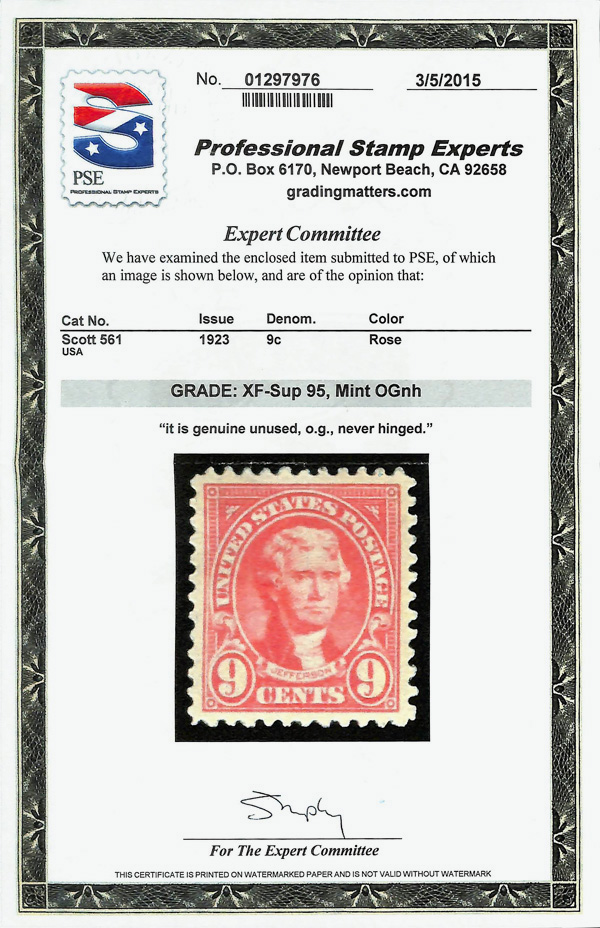 7152 nh 561 image1923, 9¢ Jefferson (Scott 561), o.g., never hinged, Extremely Fine to Superb, with 2015 P.S.E. certificate graded XF-SUP 95.