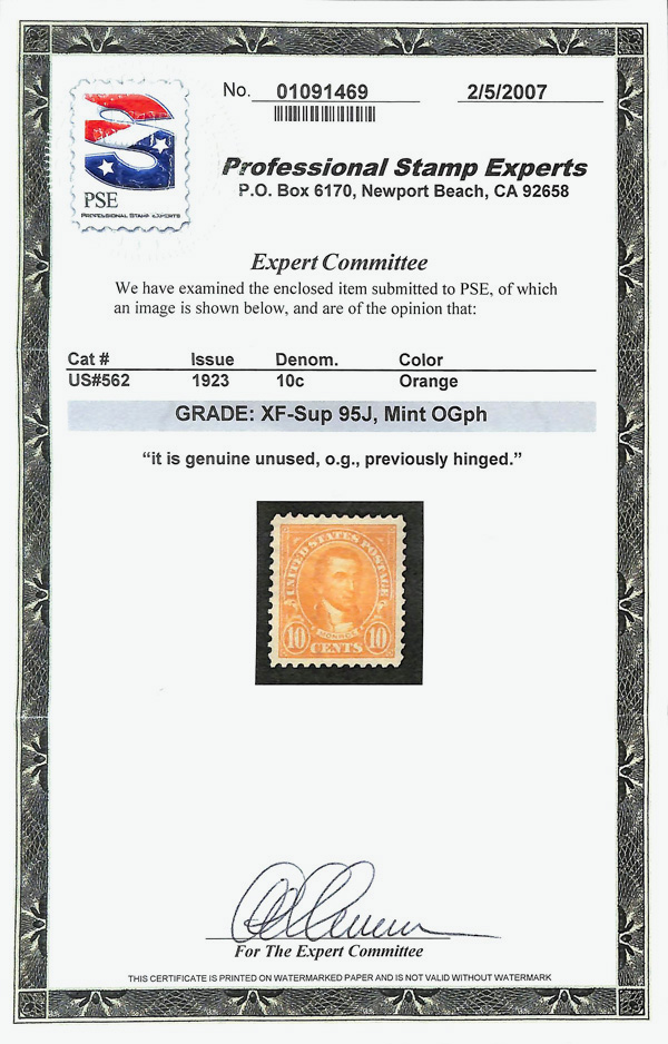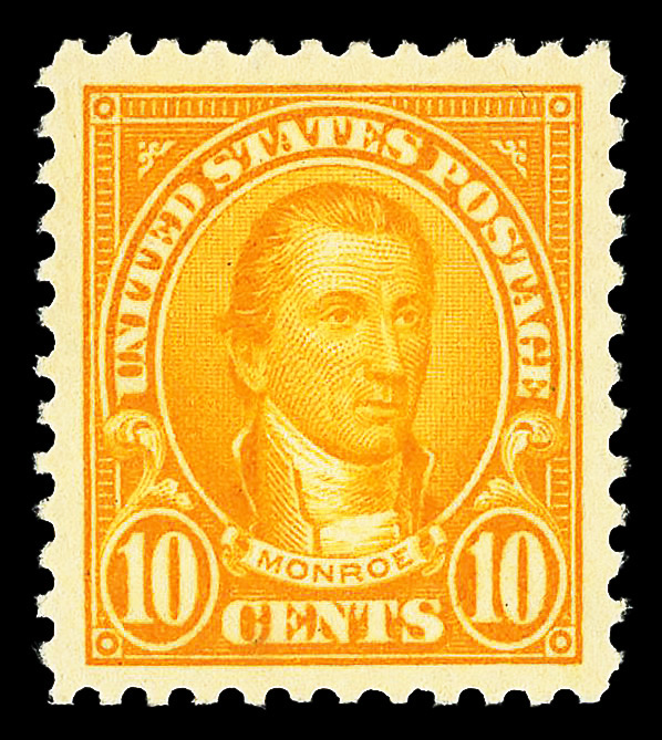 7153 og 562 image1923, 10¢ Monroe (Scott 562), o.g., lightly hinged, jumbo margins, Extremely Fine to Superb, with 2007 P.S.E. certificate graded XF-SUP 95J.