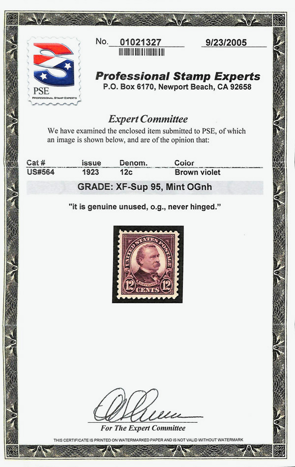 7154 nh 564 image1923, 12¢ Grover Cleveland (Scott 564), o.g., never hinged, Extremely Fine to Superb, with 2005 P.S.E. certificate graded XF-SUP 95.