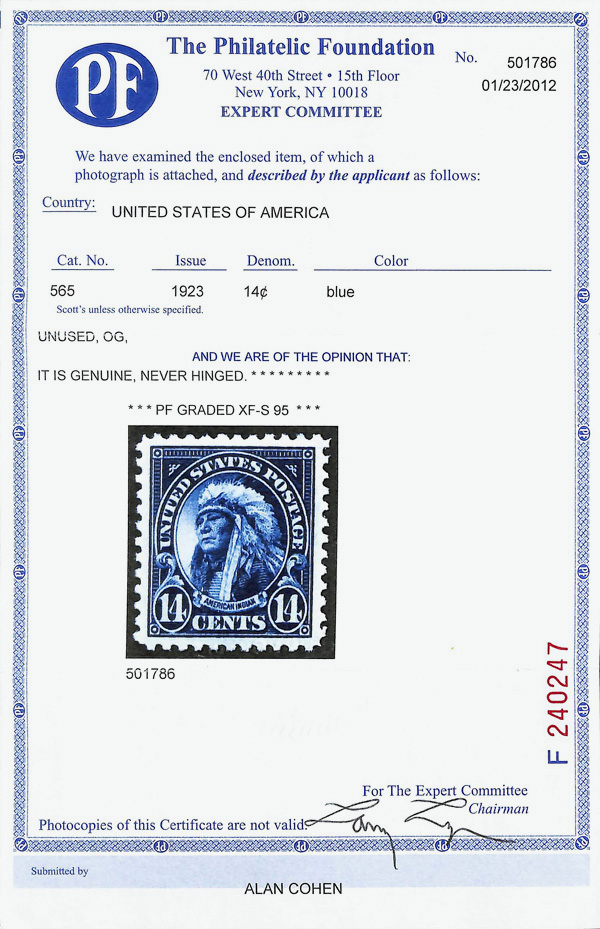 7155 nh 565 image1923, 14¢ American Indian (Scott 565), o.g., never hinged, Extremely Fine to Superb, with 2012 P.F. certificate graded XF-SUP 95.