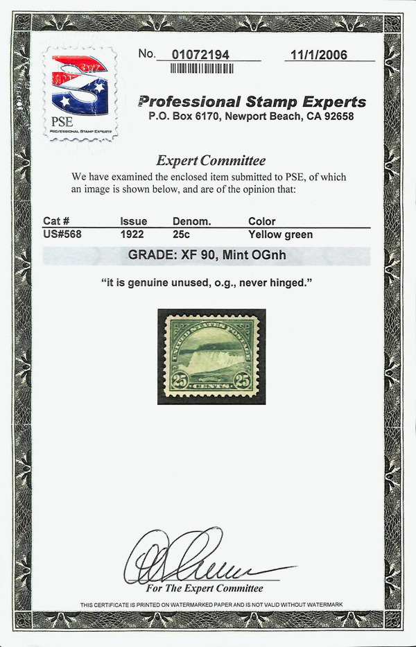 7157 nh 568 image1922, 25¢ Niagara Falls (Scott 568), o.g., never hinged, Extremely Fine, with 2005 P.S.E. certificate graded XF 90.