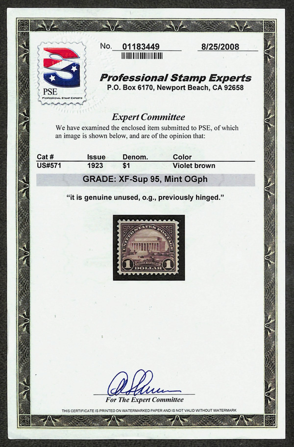 7160 og 571 image1923, $1 Lincoln Memorial (Scott 571), o.g., lightly hinged, Extremely Fine to Superb, with 2008 P.S.E. certificate graded XF-SUP 95.