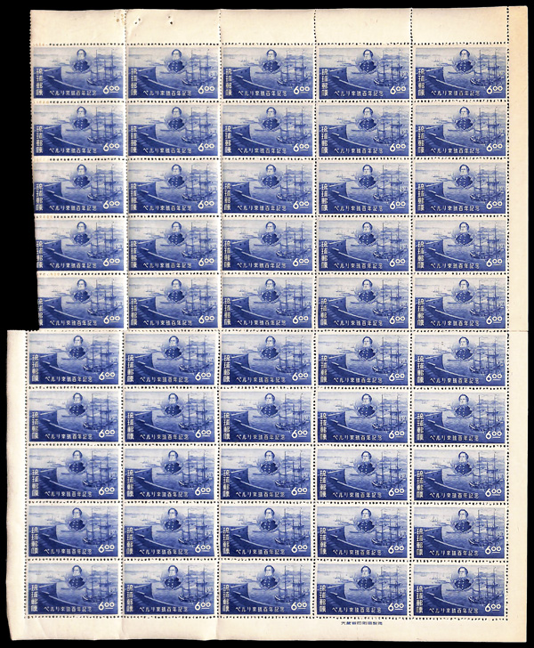 8473 nhbl 28 image1953, 6y Centenary of Commodore Perry's Visit to Okinawa (Scott 28), pane of 50 (some separations & folds), o.g., never hinged, Extremely Fine.