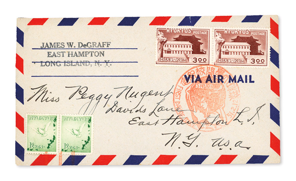 8463 cover 14 image1950, 3y Opening of Ryukyu University (Scott 14), pair on air mail 1st day cover with red rubber stamp cachet and an added pair of 12y green., Very Fine to Extremely Fine.