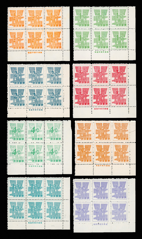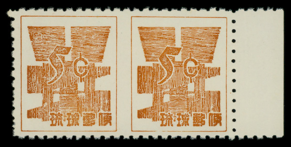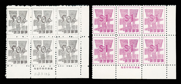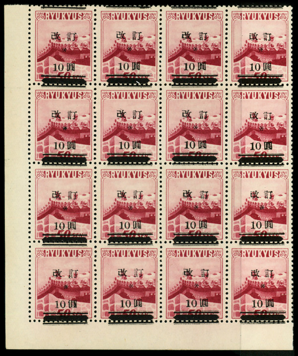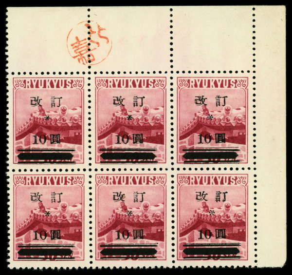 8466 ogbl 16 image1952, "Kai Tei" (revalued) surcharge, type II (2nd printing), 10y on 50s dark carmine rose (Scott 16), top Higa Seal imprint block of 6, slightly disturbed o.g. (pencil marks on gum), Very Fine.