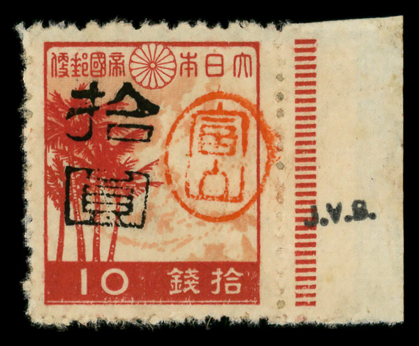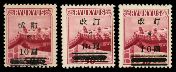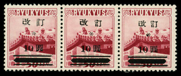 8451 ng 3X31 imageMiyako District, 1947, handstamped surcharge on Palms and Map, 10y on 10s crimson & dull rose (Scott 3X31), stuck down, Extremely Fine.