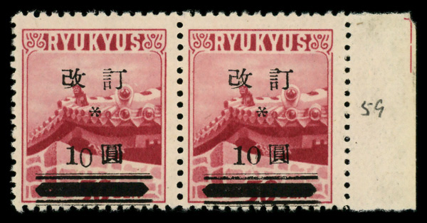8465 nh 16 & 16h image1952, "Kai Tei" (revalued) surcharge, type II (2nd printing), 10y on 50s dark carmine rose, wrong font for '0' (Scott 16 & 16h), position 59, pair, o.g., never hinged, Fine.