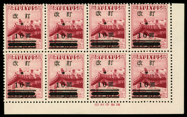 8468 nhbl 16B image1952, "Kai Tei" (revalued) surcharge, type III (3rd printing), 10y on 50s dark carmine rose (Scott 16B), imprint block of 8, o.g., never hinged, Fine to Very Fine.